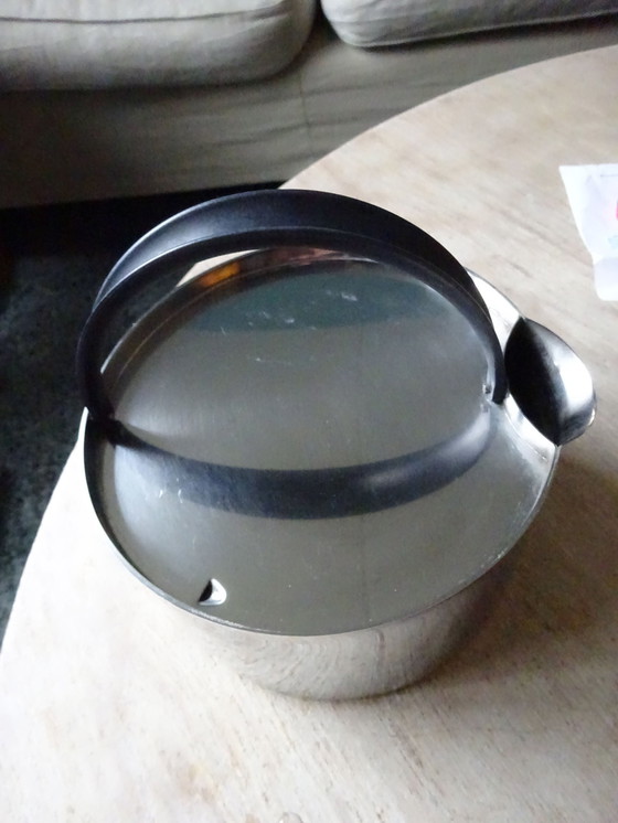 Waterketel Ontwerp: Erik Magnussen Jaar: 1988 Uitvoering: Stelton Inhoud: 2.2 liter Materiaal: RVS en kunststof Hoogte met handvat: 18 cm. Hoogte zonder handvat: 11 cm. Diameter 18 cm. Land: Denemarken Conditie: gebruikt, maar mooie staat ( zie foto's)