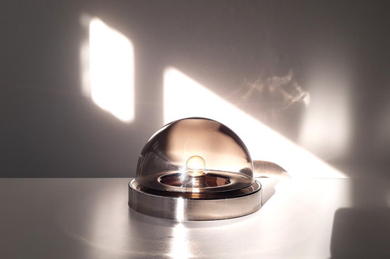 Deze mcm lamp heeft een verchroomd armatuur, waar een glazen kap op bevestigd is middels een schroefdraad-constructie. De kap heeft de vorm van een gehalveerde bol en is gemaakt van (bruin) rookglas.