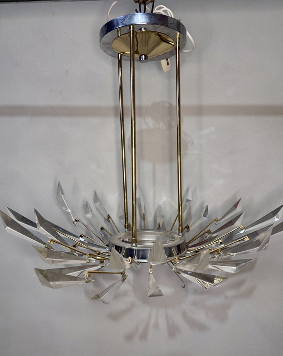 Dit specifieke model, dat doet denken aan een zonne-explosie of een geometrisch 'scherf'-patroon, heeft een verchroomde metalen of messing structuur met armen die dikke, puntige kristallen prisma's ondersteunen. Het bijzondere kenmerk is de manier waarop het glas het licht breekt, waardoor dynamische schaduwen op de muren ontstaan, typisch voor de Space Age-stijl en het fin-de-siècle modernisme.