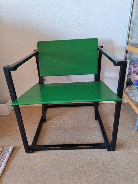 Breng een vleugje moderniteit in je interieur met deze opvallende stoel à la Rietveld. De strakke lijnen en de frisse groene kleur maken het een echte eyecatcher in elke ruimte. Perfect voor liefhebbers van minimalistisch design die op zoek zijn naar een uniek stuk voor hun woonkamer of studeerkamer.\n\n- Gemaakt van stevig hout met een groene en zwarte afwerking die de iconische stijl van Rietveld weerspiegelt. Stijlvol, een must-have voor designliefhebbers die een stukje geschiedenis in huis willen halen. Een bijzondere meubelstuk!