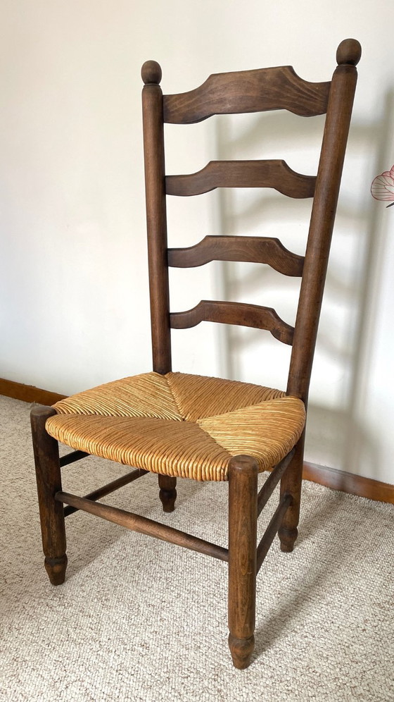 Schitterende vintage lage stoel, ook wel bekend als een "haardstoel", gemaakt van massief eikenhout en stro, daterend uit de jaren 50, in de stijl van Charles Dudouyt.