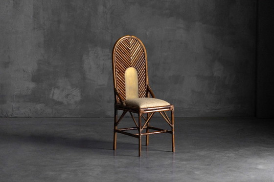 Deze stoel met hoge rugleuning, ontworpen door Gabriella Crespi in Italië in de jaren 1970, combineert bamboe met verfijnde messing details. De geweven geometrische rugleuning en warme natuurlijke patina weerspiegelen Crespi's kenmerkende stijl. De zitting, bekleed met geweven stro, zorgt voor comfort en texturale diepte.