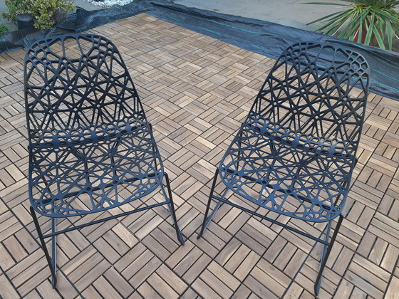 Twee stoelen Crassevig, model Nett in de kleur zwart. Ontwerp door Ton Haas. Gemaakt van hoogwaardig kunststof, stalen frame. Stapelbaar en voorzien van rubber doppen ter bescherming. Lichte beschadigingen op tafelhoogte (zie detailfoto).