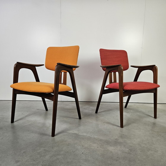 Set van 2 vintage stoelen van Pastoe, ontworpen door Cees Braakman in de jaren '50. Prachtige teakhouten frames met recentelijk vernieuwde bekleding. In de kleuren oranje en donkerroze/oranje. Verkeren in zeer nette staat.