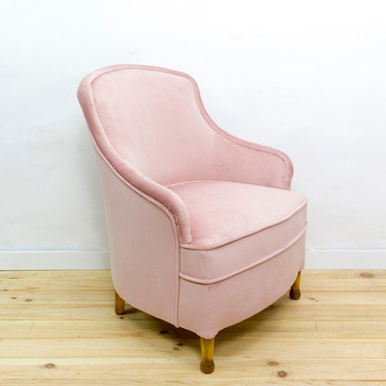 Mid-century fauteuil opnieuw bekleed met roze fluweel.