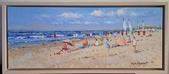 Beleef de zomerse sfeer met dit prachtige strandgezicht van A. van Noort. De levendige oranje parasols en de blauwe zee brengen direct een gevoel van vakantie en ontspanning in je huis. Dit schilderij is een uniek stuk van de zoon van AC van Noort, die zijn eigen draai geeft aan de stijl van zijn vader met frisse kleuren en een moderne touch.