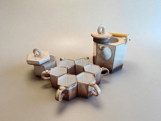 Studio Pottery Theeservies Zeshoekig Gesigneerd FB Jaren 70 Japanse Stijl / Studio Pottery Theeservies Zeshoekig Gesigneerd FB