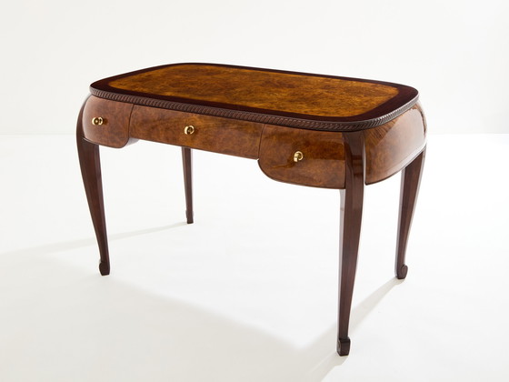 Dit bureau van walnoot, palissander en amboyna-fineer stamt uit het begin van de jaren 1920 en is gemaakt door Louis Süe en André Mare. Het neemt ons mee naar het hoogtepunt van de Art Deco periode. De elegante rondingen, het blad dat wordt geaccentueerd door een gedraaide houten bies, de poten met taps toelopende mantelpoten die eindigen in kleine voluten, en de drie koperen handgrepen die perfect contrasteren met de amboyna braam, maken het tot een werk van zeldzame finesse, kenmerkend voor het werk van Louis Süe en André Mare. Dit bureau is gemaakt voor een van de winkels van de beroemde Linzeler familie, bekend om hun eeuwenlange betrokkenheid bij juwelen en zilversmeden. Het is volledig gerestaureerd, gepolijst met traditionele schellakvernis en verkeert in uitstekende staat. Het is gestempeld met het merk van La Compagnie des Arts Français. Literatuur: Florence Camard, Süe & Mare et la Compagnie des Arts Français, Les éditions de l'amateur, Parijs, 1993, vergelijkbaar model vermeld onder nummer 238, pagina 279. De twee Franse ontwerpers ontmoetten elkaar op de Académie Julian Louis Süe. Hoewel hun achtergronden, smaken en ideeën verschilden, werkten schilder André Mare (1885-1932) en architect Louis Süe (1875-1968) samen aan veel creaties. Ze maakten zich los van de Art Nouveau en streefden naar een perfecte combinatie van esthetiek en functionaliteit. Na de oprichting van de Ateliers Français in 1912 gingen ze verder in hun zoektocht naar innovatie, elegantie en verfijning en richtten ze in 1919 de Compagnie des Arts Français op. Dit was in die tijd een baanbrekende revolutie in de wereld van meubilair en decoratie. Veel schilders, waaronder Dunoyer de Segonzac en Véra, sloten zich aan bij deze instelling, die een grote impact had op de Internationale Tentoonstelling van Decoratieve Kunsten in 1925. André Mare en Louis Süe ontwierpen ook het paviljoen voor het Museum voor Hedendaagse Kunst.