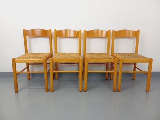 Suite van 4 Vintage Brutalistische stoelen in licht hout en stro uit de jaren 70 en 80