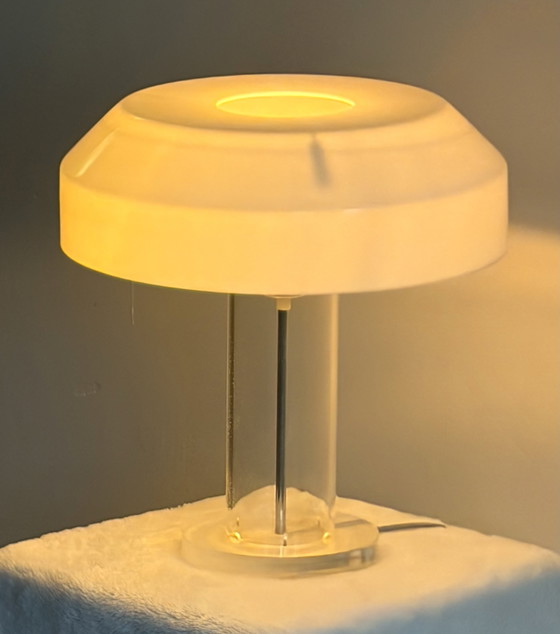 Prachtige en zeldzame ABN AMRO tafellamp, ontworpen in opdracht van de ABN Amro bank door Aldo van den Nieuwelaar. Deze iconische lamp is gemaakt van plexiglas/perspex en verkeert in uitstekende staat. De kap is ook geheel onbeschadigingd. Compleet met de 3 zeldzame originele kapverhogers. Een echt designstuk voor de liefhebber van Nederlandse vormgeving en een waardevolle aanvulling op elk interieur.