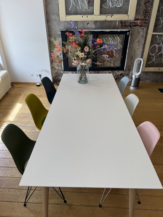 Tafel van Nederlands designlabel: Ruijch. Tafelblad is gemaakt van massief MDF en voorzien van witte lak. Het blad loopt dunner af aan de onderzijde. Poten zijn van blank, massief en onbewerkt hout. Tafel is ruim anderhalf jaar oud en als nieuw - nauwelijks gebruikt.