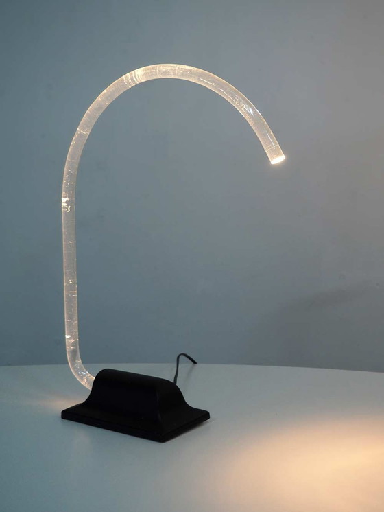Bijzonder, zeldzame tafellamp met plexiglas massieve buis waardoor het licht gaat. Simpel maar prachtig ontwerp van Edy ten Berge. De zwart keramieken voet maakt het geheel compleet.