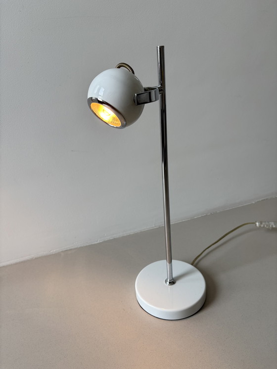 Verlicht uw ruimte met deze prachtige vintage "Eyeball" tafellamp uit de jaren 80. Het strakke design, gekenmerkt door een opvallend wit en zilver kleurenpalet, vat moeiteloos de essentie van retro elegantie samen.