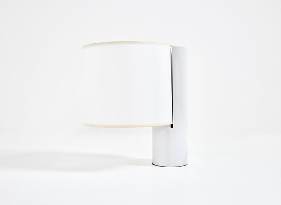 Witte lamp met metalen voet en stoffen kap ontworpen door Giuliana Gramigna. Model: Fluette. Met originele doos. Slijtage door de tijd en leeftijd van de lampen.