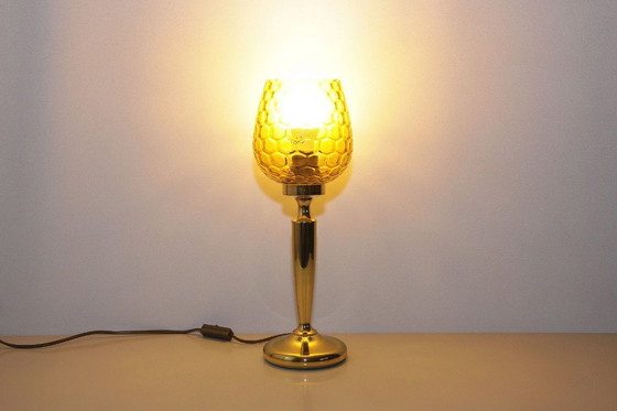Elegante tafellamp in een klassieke retro- en vintage stijl uit de jaren 80. De lampvoet is gemaakt van glanzend messing, gecombineerd met een kelkvormige glazen kap, wat zorgt voor een zacht, aangenaam licht.