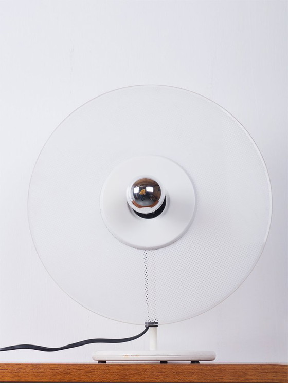 Tafellamp met transparante kunststof schijf. Gemerkt met Piattelo Setluce. Geeft een mooie weerspiegeling op de achterwand bij gebruik kopspiegellamp.