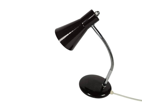 Ervaar de charme van de jaren '70 met dit prachtige vintage tafellampje uit Italië. Met zijn elegante 'gooseneck' ontwerp en chroomafwerking voegt deze lamp een vleugje retro-stijl toe aan elke ruimte. Perfect voor uw bureau of leeshoek, biedt het zowel functionaliteit als esthetiek.