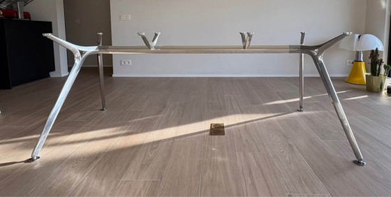 Moderne tafelonderstel ontworpen voor een glazen blad, ideaal om een eigentijdse touch aan uw interieur te geven. Zilverkleurige afwerking en strak design.