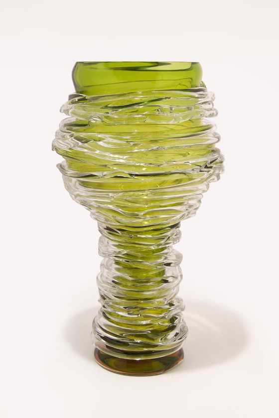 De kunstenaars van l'Anverre probeerden vaak de geest van de kindertijd in hun creaties op te roepen. Dit zien we terug in hun gebruik van levendige kleuren en wervelende vormen, zoals deze vaas die doet denken aan druipende honing. De combinatie van verschillende soorten glas, kristalhelder en groen, creëert een speels kleurenpalet.