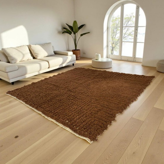 Verrijk uw woonruimte met dit prachtige handgemaakte wollen vloerkleed, een perfecte mix van luxe en comfort. De rijke bruine tint, aangevuld met subtiele beige ondertonen, voegt warmte en verfijning toe aan elke kamer en creëert een uitnodigende sfeer.