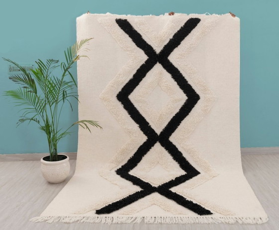 Maak kennis met dit prachtige, handgemaakte wollen vloerkleed, een toonbeeld van Marokkaans vakmanschap en een bewijs van traditionele weeftechnieken. Het elegante ontwerp en de luxueuze textuur maken het een perfecte aanvulling op elk stijlvol interieur. Het neutrale kleurenpalet, met een opvallend zwart geometrisch patroon op een zachte crèmekleurige achtergrond, past moeiteloos bij diverse interieurstijlen, van modern minimalistisch tot klassiek elegant. Met een afmeting van 200 cm bij 150 cm is dit kleed ideaal om warmte en karakter toe te voegen aan uw woonkamer, slaapkamer of studeerkamer.