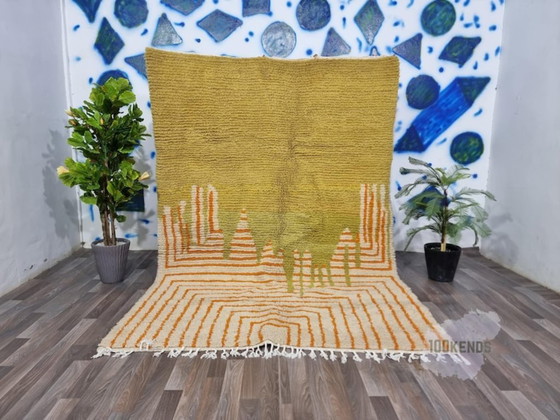 Laat u betoveren door de rijke texturen en levendige kleuren van dit prachtige Marokkaanse wollen tapijt. Met oog voor detail handgemaakt, voegt dit kleed een vleugje bohemian elegantie toe aan elke ruimte. Het opvallende ontwerp combineert harmonieus geel, oranje en groen, wat zorgt voor een warme en uitnodigende sfeer.