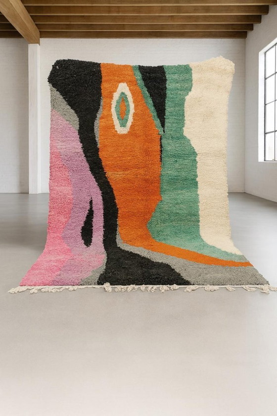 Ervaar de levendige charme van Marokkaans vakmanschap met dit prachtige vloerkleed van natuurlijke wol. Met indrukwekkende afmetingen van 300 cm bij 200 cm is dit kleed een toonbeeld van traditioneel vakmanschap en modern design. De gedurfde, abstracte patronen en het rijke kleurenpalet zorgen voor een opvallend visueel effect, waardoor het een perfecte blikvanger is voor elke stijlvolle woonruimte. De luxueuze textuur van de wol biedt zowel comfort als duurzaamheid, waardoor dit vloerkleed jarenlang een geliefde aanwinst voor uw huis zal zijn.