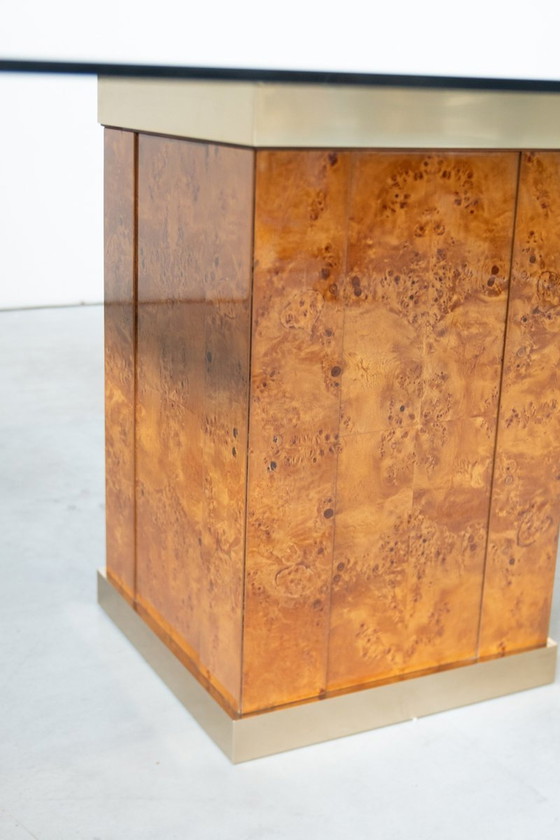 Vintage eettafel toegeschreven aan Jean Claude Mahey voor Roche Bobois - jaren 1980 Deze prachtige vintage eettafel, toegeschreven aan de beroemde Franse ontwerper Jean Claude Mahey voor Roche Bobois, belichaamt de luxe stijl van de jaren 1980. Mahey wordt geroemd om zijn modernistische creaties die hoogwaardige materialen combineren met strakke geometrische vormen, waardoor deze tafel een pronkstuk wordt Belangrijkste kenmerken: Ontwerper Toeschrijving: Toegeschreven aan Jean Roche Bobois Kwaliteit: Manuf 1980s Esthetiek: Deze tafel benadrukt de glanzende afwerking en minimalistische lijnen die kenmerkend zijn voor design uit de jaren 1980 en brengt een vleugje vintage luxe in elke ruimte. Veelzijdig Statement Stuk: Of hij nu in een moderne of klassieke omgeving staat, deze tafel valt op door zijn verfijnde eenvoud en tijdloze stijl. Ruim en functioneel: Ontworpen met het oog op functionaliteit, biedt hij voldoende ruimte om aan te dineren en te entertainen en biedt hij comfortabel plaats aan meerdere gasten. Herkomst: Frankrijk, jaren 1980 Afmetingen: Breedte: 116 cm Diepte: 116 cm Hoogte: 75 cm Verhoog je eetkamer met deze prachtige tafel van het iconische merk Roche Bobois. De combinatie van elegantie en praktisch nut maakt het een must-have voor verzamelaars van vintage meubilair en degenen die hun ruimte willen voorzien van jaren '80 glamour.
