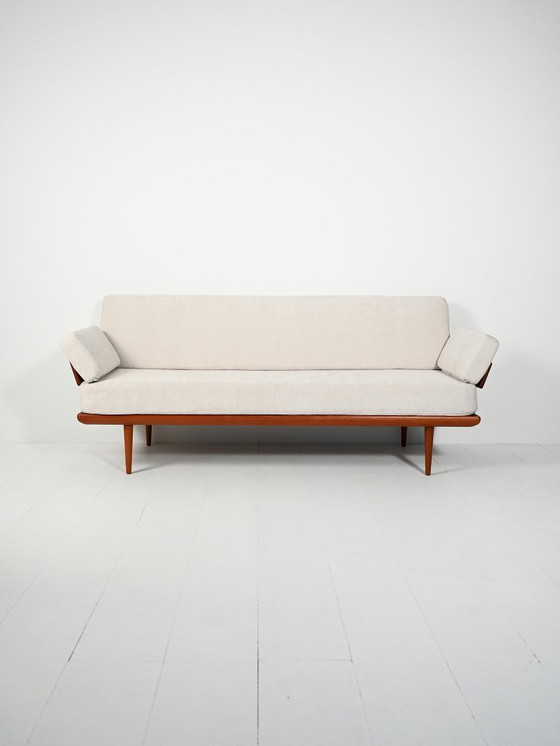 Verfijnde "Minerva" sofa van Peter Hvidt & Orla Mølgaard-Nielsen voor France & Søn, jaren 60. Teakhouten platformframe met afgeronde rand, taps toelopende gedraaide poten en een rechthoekige rugleuning op stalen staanders. Elastische lattenbodem met doorlopende draadveren ondersteunt nieuw gemaakte, ijsgrijze microvezelkussens met afneembare hoezen. Origineel fabriekslogo aanwezig.