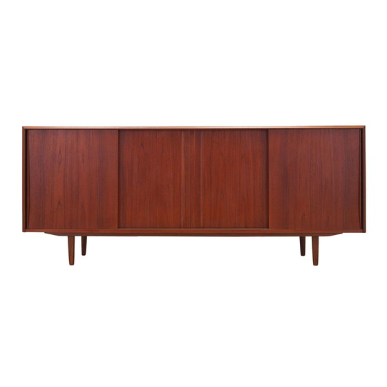 Het dressoir is gemaakt in de jaren 1960, ontworpen door de bekende Deense ontwerper E.W. Bach. De structuur is bekleed met teakfineer. De poten zijn gemaakt van massief hout. Het oppervlak is opgefrist. Binnenin is de ruimte opgevuld met drie praktische, in hoogte verstelbare planken en twee ruime lades. Het meubel heeft een praktische schuifdeuroplossing, waardoor er minder ruimte voor het meubel nodig is, maar de toegang tot het interieur niet wordt belemmerd. Een extra troef van het meubel is de decoratieve spiegel. Staat: Oppervlak na opfrissing. Zichtbare kleine krassen en opgevulde fineerfouten. Grotere gebruikssporen zijn altijd zichtbaar op de foto's. Product klaar voor gebruik. *Om veiligheidsredenen kunnen de poten van het meubel worden losgeschroefd en de schuifdeuren en planken worden verwijderd om te worden vervoerd. Montage mag geen probleem zijn. Neem bij twijfel contact met ons op en we sturen je een instructievideo. Technische gegevens hoogte: 80 cm breedte: 196 cm diepte: 44 cm