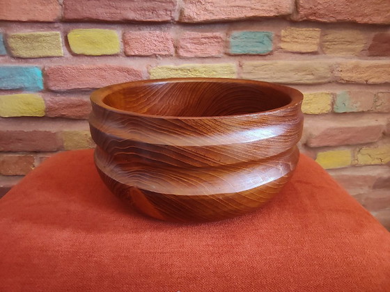 Prachtige vintage teakhouten schaal uit Denemarken. Goede staat. De foto's tonen een paar krasjes en een klein scheurtje op de voet. Dikke, gedraaide rand met mooie groeven.