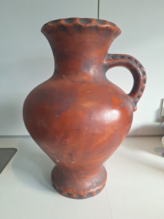 De vaas heeft een handvat en een gebeeldhouwde rand aan de boven- en onderkant, wat bijdraagt aan de decoratieve uitstraling.