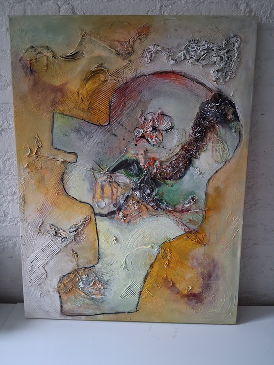 Dit abstracte kunstwerk, getiteld 'The eye that looks inside me', is een boeiende mix van kleuren en texturen. Het stuk is gemaakt met een gemengde techniek op canvas en toont een intrigerende combinatie van oranje, groen en warm gele tinten. De complexe lagen en structuren nodigen de kijker uit om dieper te kijken en hun eigen interpretatie te vormen. Perfect voor liefhebbers van abstracte kunst die op zoek zijn naar een uniek en expressief stuk.