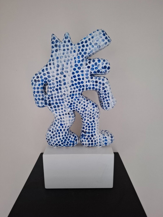 Beeld, Iconic dog, mixed media. Duurzame materialen, esthetisch bewerkt en vernist. Het beeld is authentiek en uniek en enig exemplaar. Het beeld is ook een designitem, tijdloos en een meerwaarde voor het interieur. Het beeld is handgesigneerd. Marie-Jeanne van de Velde (MJ), 15.10.1957 is een geschoold hedendaagse Vlaamse kunstenaar uit Ronse, Belgie. Website ; https:// www.mjmad.be, Arts and Crafts by MJ. instagram/bymjmad. Geboren met een artistiek oog, en een passie voor schilderen, beeldhouwen. juwelen en keramiek maakt zij onder de naam MJ. Het werk kan abstract of figuratief zijn. De materie kan een esthetische of symbolische betekenis krijgen binnen de context van het hele werk, het kan iets van zijn oorspronkelijke identiteit behouden. Haar carrière begon als professioneel schilder in 1988 en ondertussen werd ze ook een begaafd keramiste die altijd experimenteert met nieuwe materialen en technieken. Tegenwoordig zijn haar beelden vervaardigd uit mozaiek. Haar stijl wordt sterk beinvloed door de Cobrarichting, Miro, Haring en Picasso en Mondriaan. Het is vaak een nieuwe interpretatie hiervan. Haar werken worden ook tentoongesteld in binnen- en buitenland en eigen galerij in Ronse (B). Elk werk is apart en meestal gesigneerd in het werk met MJ. De werken worden verzekerd verzonden en zorgvuldig ingepakt.