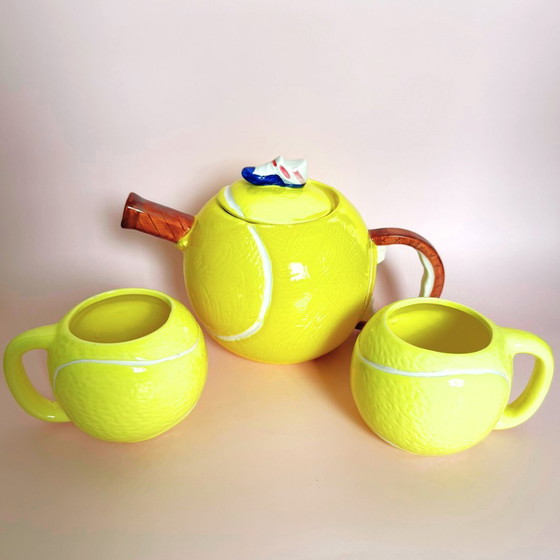 en twee kopjes (9cm hoogte x 10cm diameter) in de vorm van tennisballen.