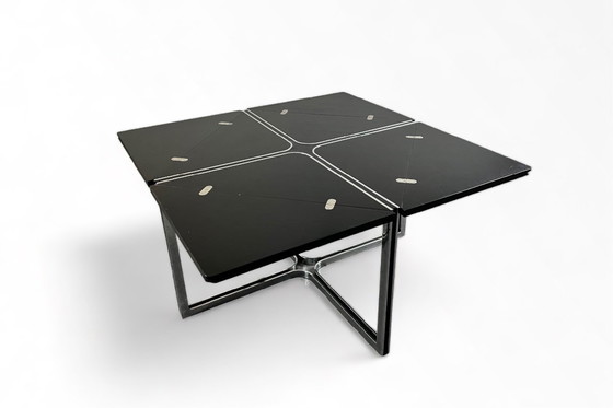 Deze fraaie uitklapbare tafel is ontworpen door Gastone Rinaldi, geproduceerd door Thema Italy in de jaren zeventig. Het stuk is van hoogwaardige kwaliteit gelakt hout met bijpassend verchroomd staal. Een prachtig stuk minimalistisch design dat dankzij het klapmechanisme naadloos past in elk decor en elke situatie.