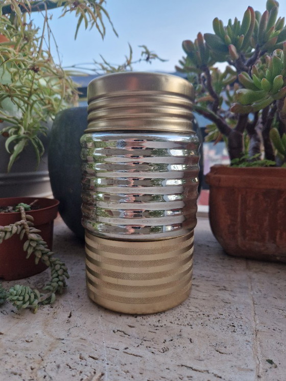 Een elegante vintage thermoskan uit de jaren 60, gemaakt van glas en aluminium.
