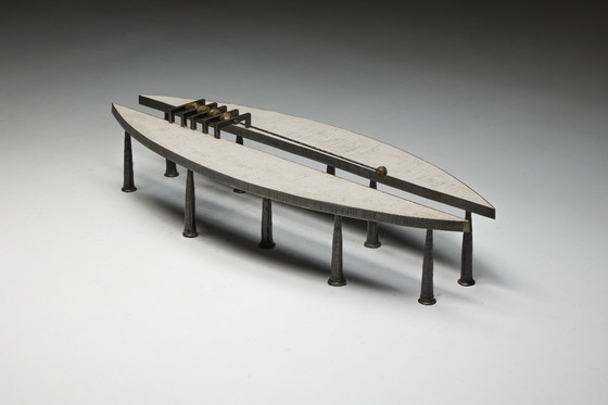 Deze salontafel, ontworpen in 2019, is een treffend voorbeeld van het werk van de Belgische ontwerper Thomas Serruys, wiens praktijk sterk beïnvloed is door machines, vakmanschap en de fysieke logica van materialen. Het langwerpige stenen blad, opgebouwd uit gesmeed staal, wordt doorsneden door een lineair element met een messing verzwaarde staaf, wat een subtiele mechanische verwijzing vormt naar Serruys' sculpturale interpretatie van functionele systemen.