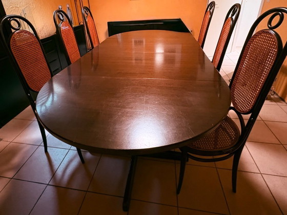 Originele gebogen beuken tafel en 6 stoelen Lange Jan van het merk Thonet. Kleur bruin, gevlochten zitvlak en rugleuning (stoelen) is 1x vernieuwd.