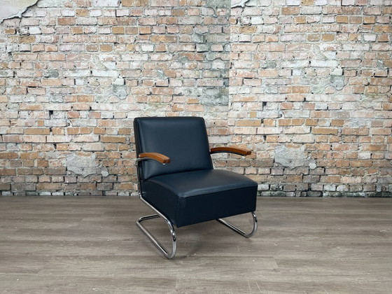De Thonet S411 is een comfortabele fauteuil met lage rugleuning, buisframe en houten armleggers: een tijdloos design uit de Bauhaus-traditie.