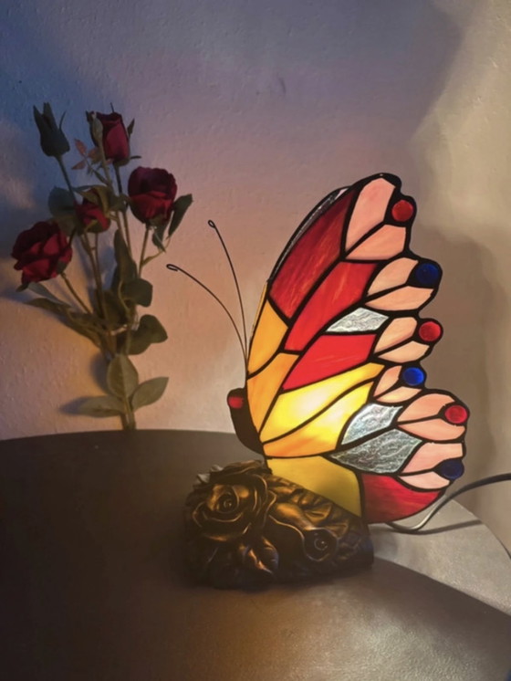 Deze betoverende Tiffany vlinderlamp brengt een vleugje kleur en speelsheid in elke ruimte. De gebrandschilderde vleugels, versierd met levendige tinten bordeauxrood, oranje, geel, roze en blauw, vangen het licht prachtig op en creëren een zachte en kleurrijke gloed. Sierlijk geplaatst op een gedetailleerde bloemvoet, is deze lamp niet alleen een lichtbron, maar ook een kunstwerk dat romantiek en elegantie toevoegt aan je huis. Perfect voor het creëren van een gezellige en magische sfeer, zal deze vlinderlamp zowel je kamer als je dag opfleuren. Details: