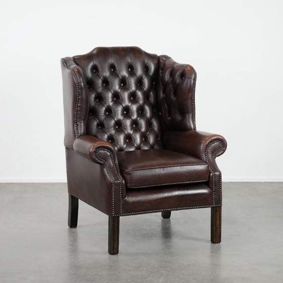 Tijdloze bruine rundleren chesterfield oorfauteuil in Engelse stijl