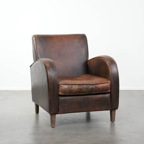 Tijdloze vintage schapenleren design fauteuil in een donkere cognac kleur