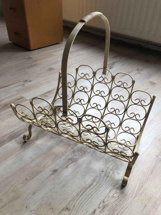 Tijdschriftenrek jaren 50 Cremekleurig draadstaal met sierlijke krullen ontwerp hoogte 25 breed 40 diep 30 hoogte hendel 45