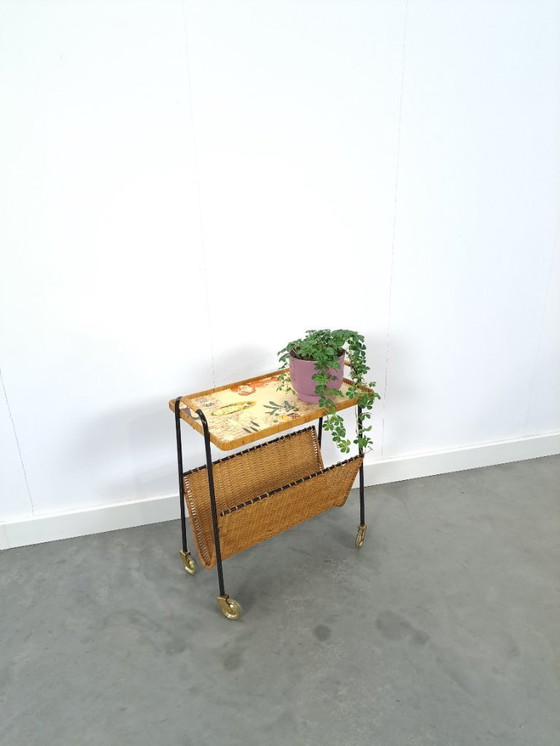 Vintage tijdschriftenrek. Het rek komt uit Duitsland en heeft een handige opberg plek voor tijdschriften en een kunststoffen dienblad met leuke print. Daarnaast heeft de trolley leuke goudkleurige wielen.