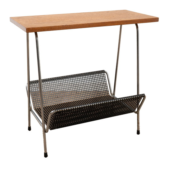 Tijdschriftenrek van Pilastro. Het rek heeft een houten oppervlak op een metalen frame.