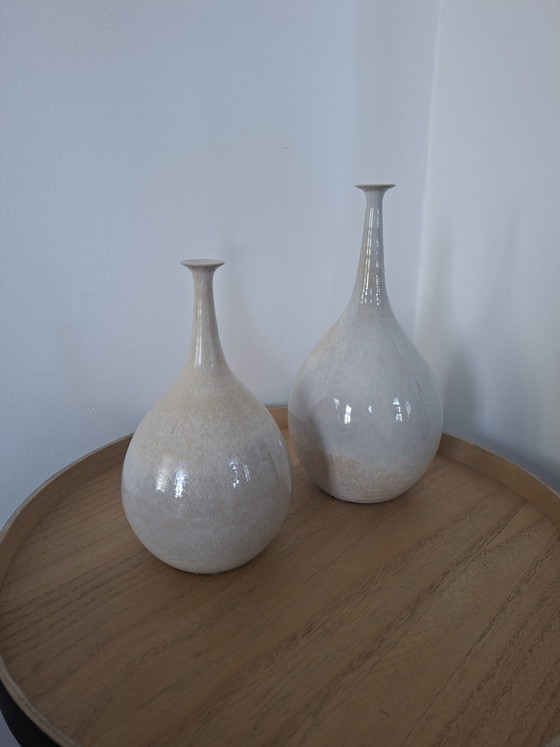 Te koop aangeboden: Een schitterende set van twee handgemaakte vazen van de Limburgse aardewerkfabriek Gubbels Helden. Het betreft het elegante druppelmodel met een zeer smalle hals, uitgevoerd in een tijdloze witte/crème finish met een subtiel spikkel-effect.
