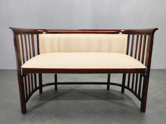 Dit verfijnde meubelstuk belichaamt de principes van de Wiener Secession, waarbij geometrische helderheid wordt gecombineerd met subtiele rondingen. Het frame is vervaardigd uit massief beukenhout, afgewerkt met traditionele schellak, wat de rijkdom van het materiaal benadrukt. De kenmerkende gebogen rugleuning en verticale latten aan de zijkanten creëren een lichte maar architectonische uitstraling.