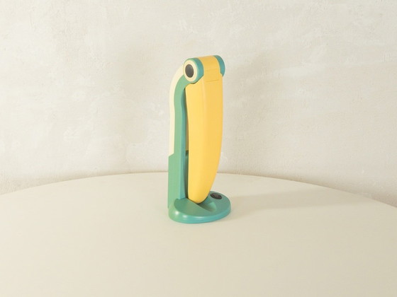 Postmoderne bureaulamp in de vorm van een toekan uit de jaren 80, ontworpen door H.T. Huang voor Huanglite. De flexibele kantelhoek van de snavel zorgt voor een variabele lichtverspreiding. Gemaakt in Taiwan.