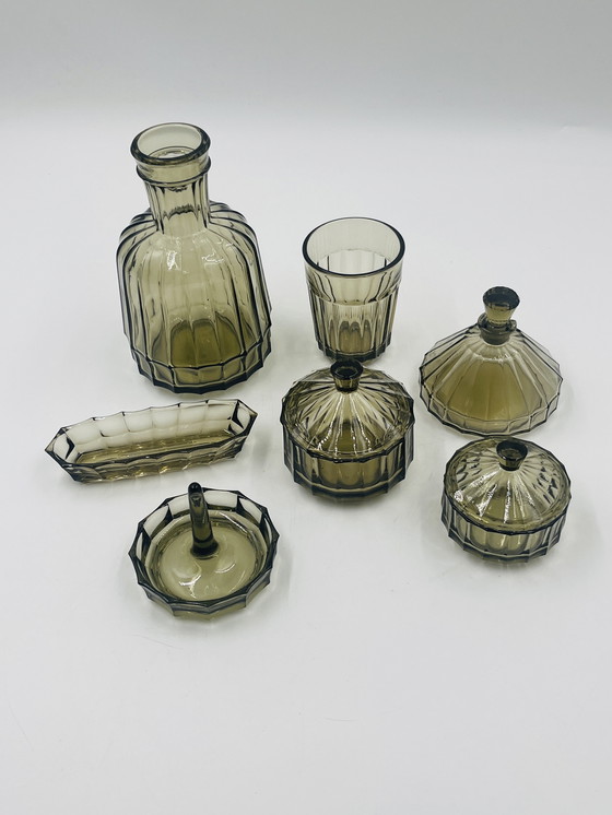 Deze verfijnde vintage toiletset getuigt van tijdloze elegantie en verfijnd vakmanschap. De prachtig op elkaar afgestemde collectie is gemaakt van hoogwaardig glas met een warme bruine tint die een vleugje verfijning toevoegt aan elke inrichting.